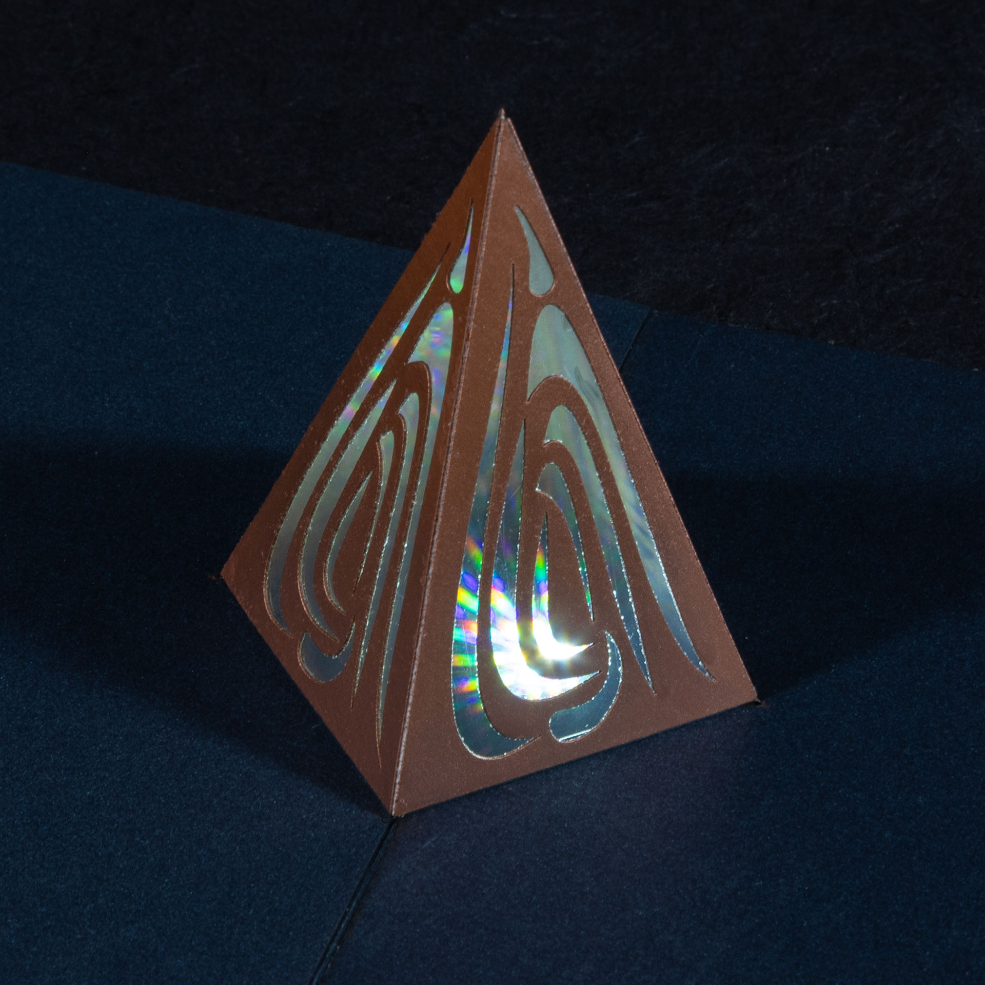 Here is my “relic” for this year’s #LightUpPopUpTober event. Another geometric abstract take like last year’s Spiral Crystal card. This pop up has integrated electronics, including a switching mechanism, flat battery, and a heartbeat pulse LED Circuit Sticker. The pyramid and pieces of the base card are all laser cut. I used diffraction grating material to get the rainbow effect.