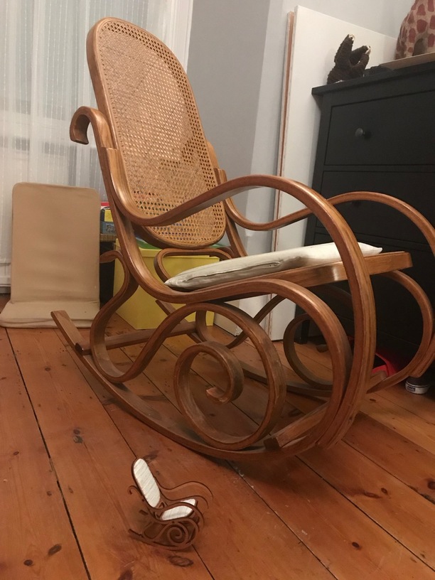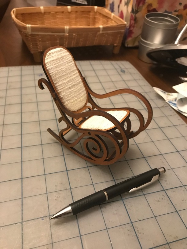 One technical note/lesson learned. The position of the rocker was good when I first assembled it, where there was no material yet in the upholstered back and seat. To do the upholstery, I cut insert pieces from dartboard for seat and back, just a wee bit smaller than the interior of the hole it fit in-- so there would be space for the material I used to go through. The fabric was from samples my neighbor gave me when buying furniture-- so it was relatively thick, like real couch fabric would be. Once I added these in the resting posting was tipped back a bit more than I liked (still upright enough, though)-- so the additional weight made a difference. I taped a 50 pence piece ending the seat to adjust and it was back to good. For a second iteration, I think I’ll use basswood for the back, and draft board for the bottom-- and potential where I put a few layers of felt in the seat I might add a coin right in there for a tiny bit more weight if needed. I know I could change the design further, but I like where it ended up after hours of tweaking!