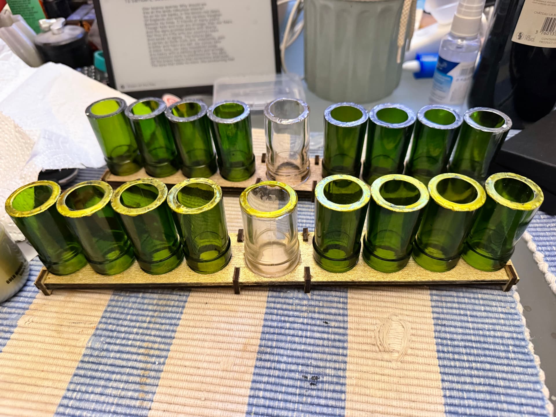 Decided to make a menorah with the necks of wine glasses and the centre candle holder the neck of a rum bottle .. 3mm ply - the clips/feet fitted perfectly and hold everything together / though also glued