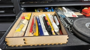 I messed up and put a side piece as the divider in the middle - wrong! So I modified it to fit by cutting off the side tabs, the whole time wondering why the tabs were offset. But by then I had tapped it in and couldn’t get it back out. and had to cut another one side. Duh! But I loved how easy it was, the kerf was just tight enough that I had to use my rubber mallet to gently nudge it together, but it’s as tight as anything. He was really happy with it, even with the inside divider not tabbed into the sides and only the bottom. So now I know that I’ll need to label the pieces myself (and ignore when cutting) so I know what is what. (sorry about the blurry pics - I can’t seem to get any of my photos to copy/insert correctly)