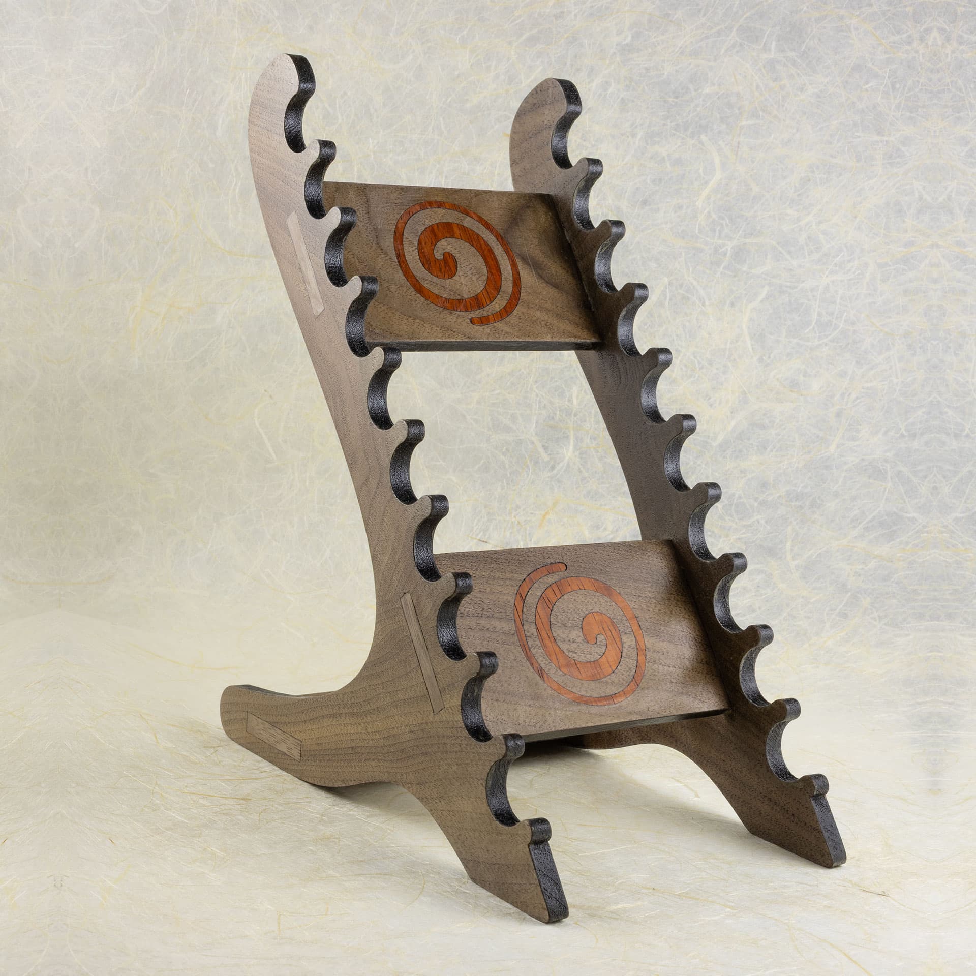 I have been wanting to make something for the pens for a couple years, but kept stalling out on a design. This came as a series of punctuated mental revisions, starting with a flat tray, then a triangular box with shelves on one face, and finally this. I made a cardboard prototype, then with few changes, the final piece. This is 6mm thick walnut hardwood with padauk for the inlay. Lots of pre-assembly sanding, simple glue-up, then three coats of wipe-on poly with sanding between coats. It turns out I have a lot of pens. So, I will probably make another one with different materials at some point.