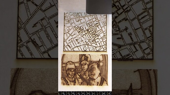 Just finishing up a couple of test engraves on non-Proofgrade birch ply. The top image (John Snow’s Cholera map) is straight from the web and the Star Wars concept art is from a photo I took at the Denver Art Museum last year.