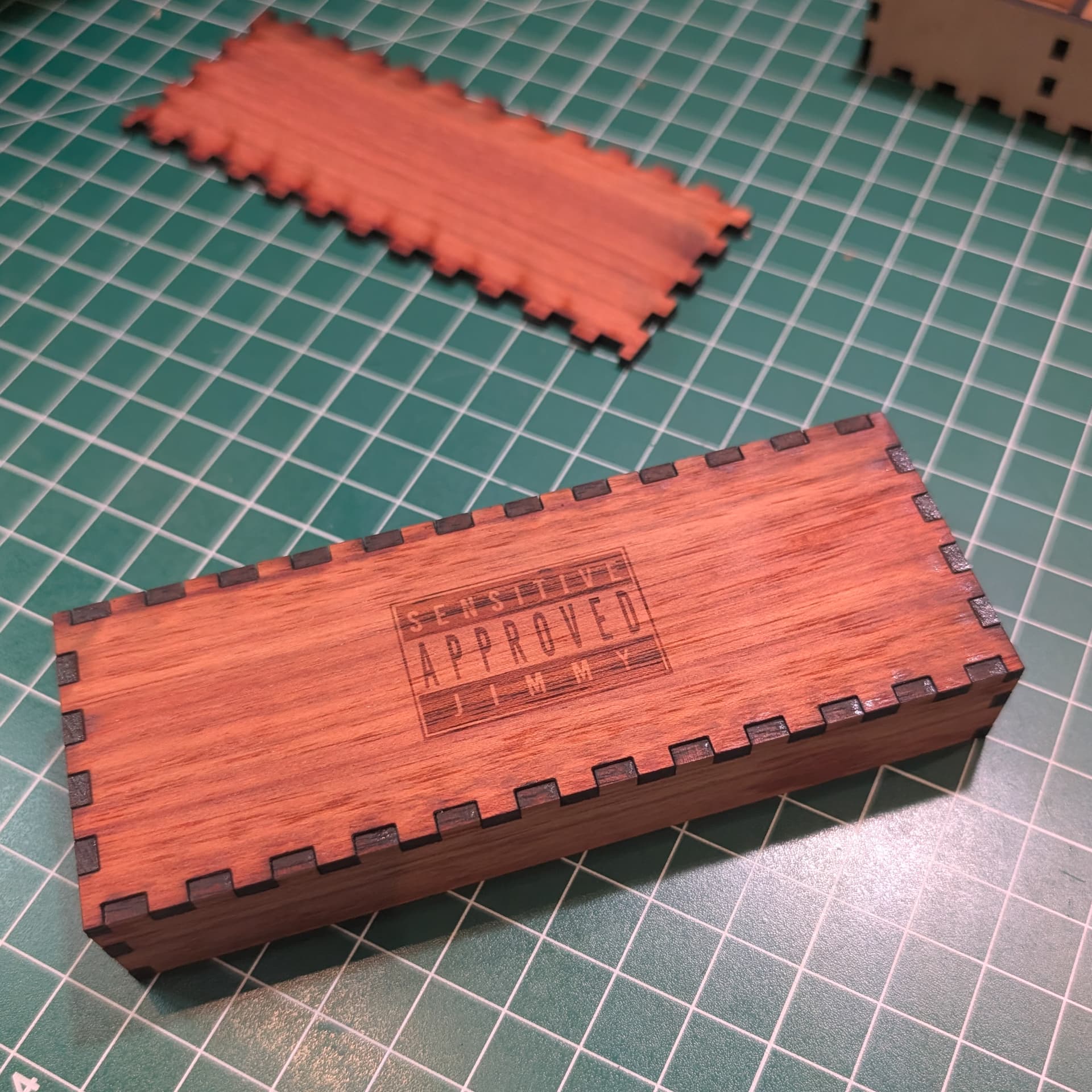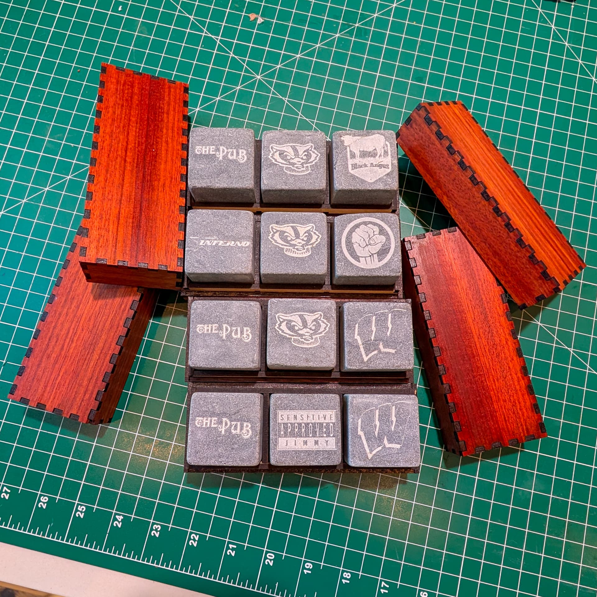 I made 4 custom boxes to house custom engraved whiskey stones as gifts for some friends who are visiting in a few weeks. Basically a Proofgrade box inside another tabbed Padauk box. Nothing fancy, and created using an online box generator and customized in Illustrator. The stones were engraved on a Mira 9, but the box was cut on the Glowforge. Still need to apply some oil, but happy how they turned out.