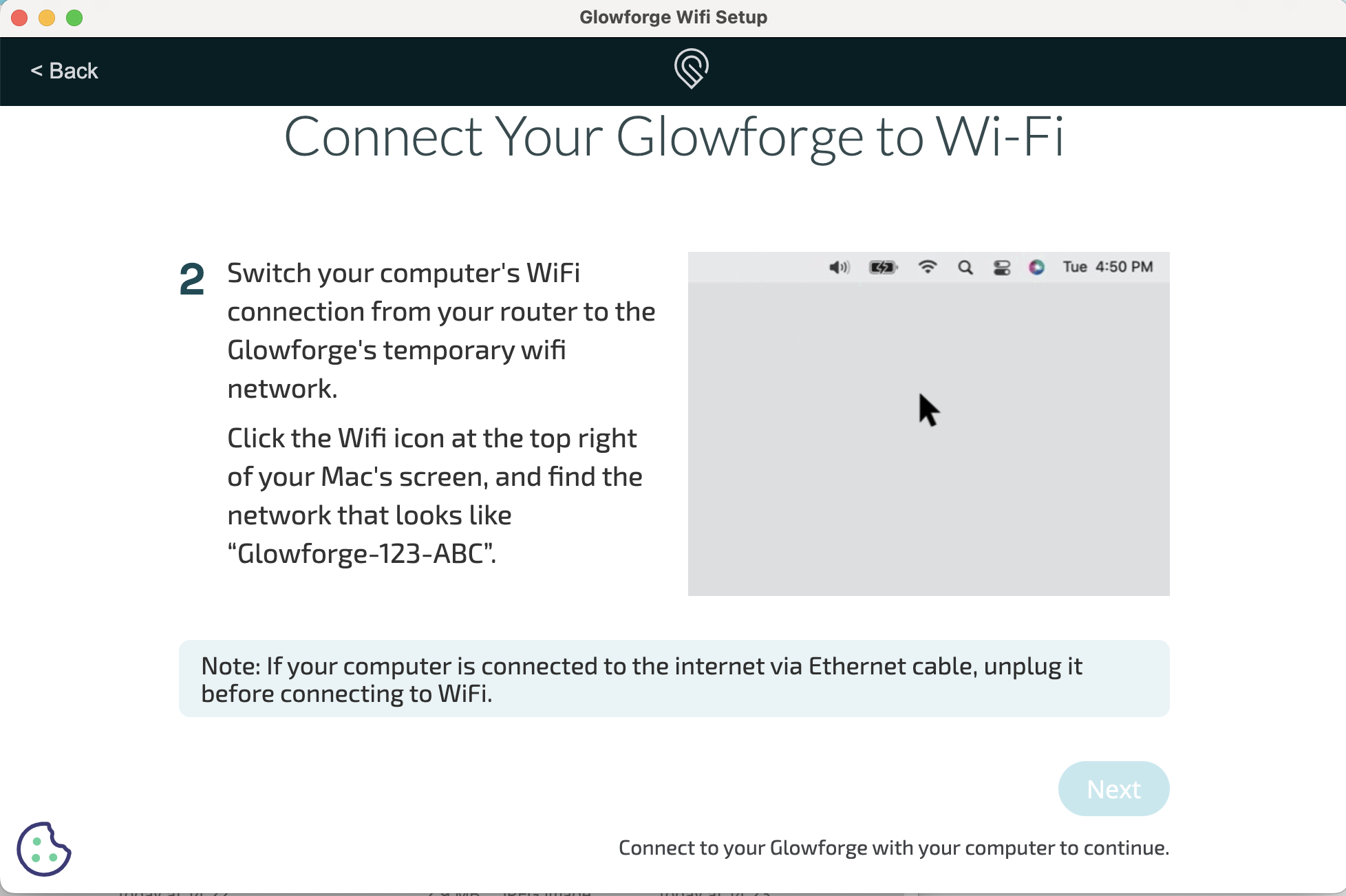 Once connected to the GF wifi (“Glowforge-…”) then the setup should detect that and allow you to select Next. So something is preventing the setup page to run correctly. Usually the browser on a phone will work if your desktop has protections in place that block it, but as stated, a different browser on either device might solve it. Have you at least tried hitting refresh once you have connected the device to the GF WiFi? A reload may allow it to detect correctly.