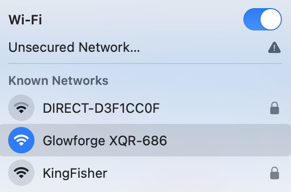 Thank you! The network shows up and I can connect to it. It shows connected on my computer. And I’ve even confirmed it by trying to use internet necessary pages/tasks on my computer when connected to the Glowforge network.