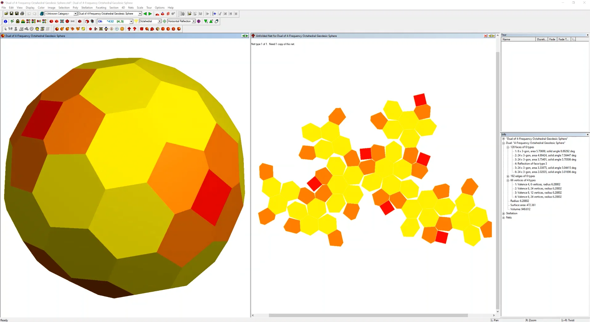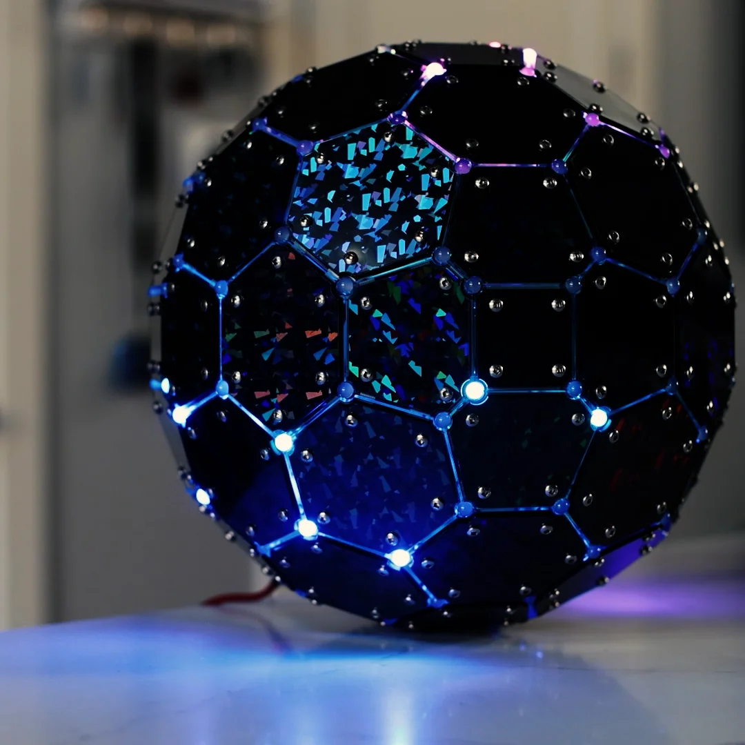 This latest polyhedral is a Dual of 4-Frequency Octahedral Geodesic Sphere, whiCh has 66 faces, 192 edges, and 128 vertices. A WLED pixel light is positioned at each vertices. The faces have two layers, Green Glass Acrylic for the base and Holographic Nightmare Iridescent Acrylic on the top. The idea was that the LED bulbs would edge-lit the bottom green glass acrylic, which ended up working splendidly. The WLED lights are powered by a Dig2Go controller. WLED has amazing effects and this really looks amazing at night. Internal connectors were 3D printed on a Bambu X1-Carbon.