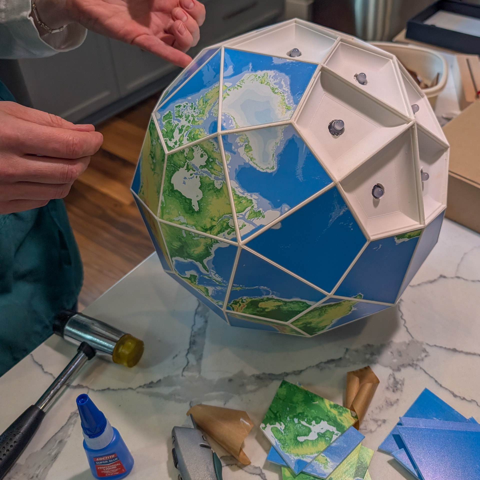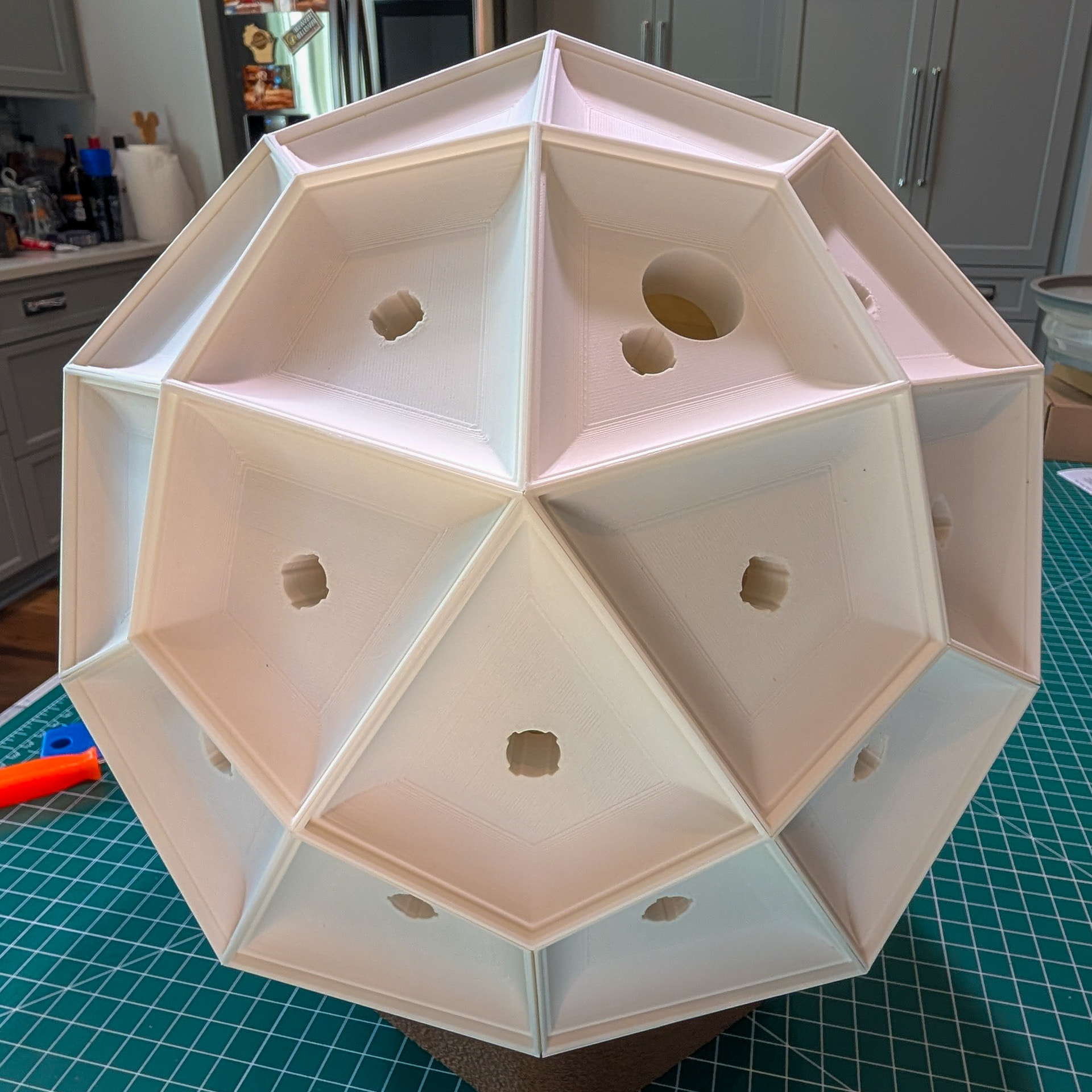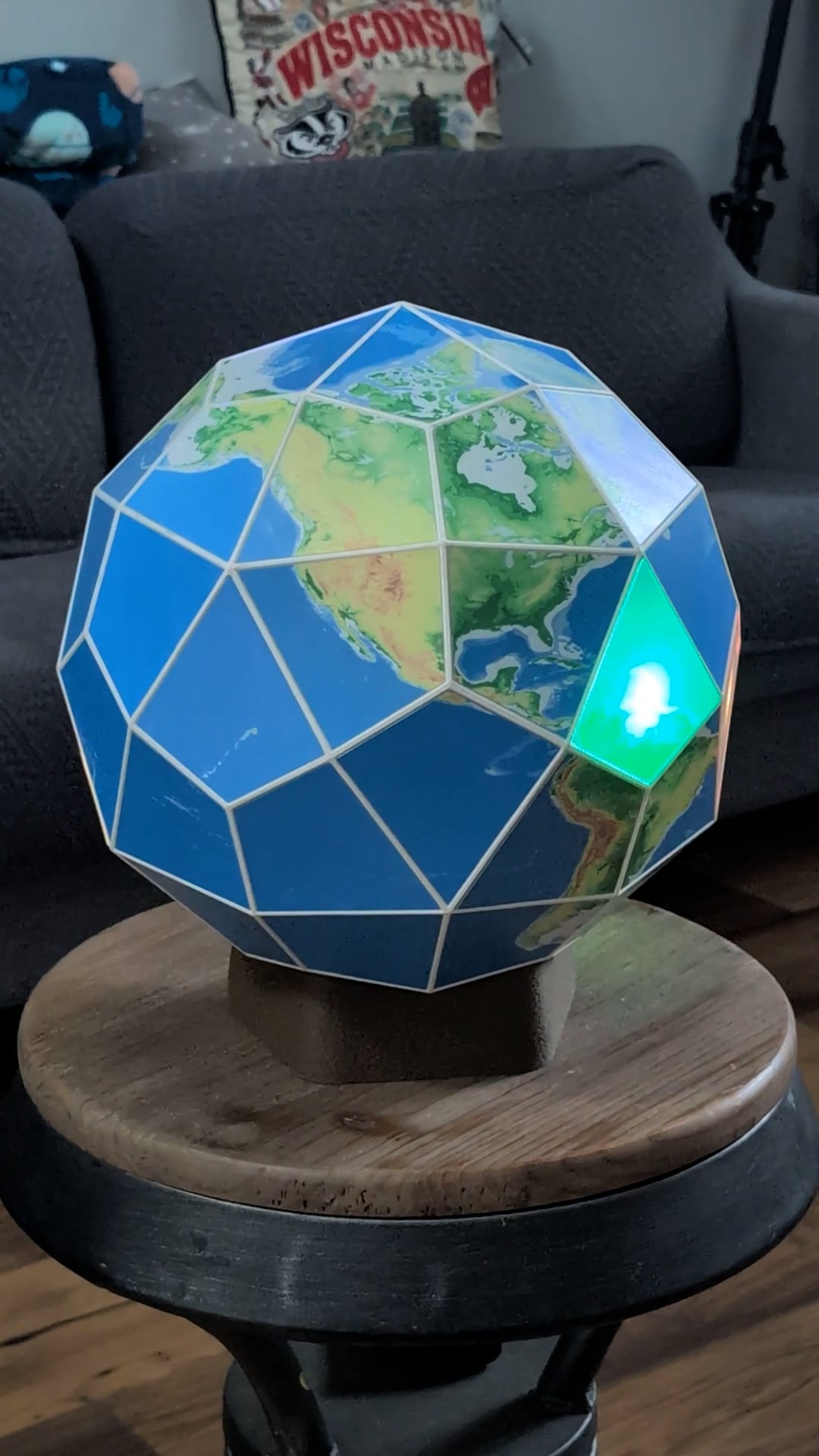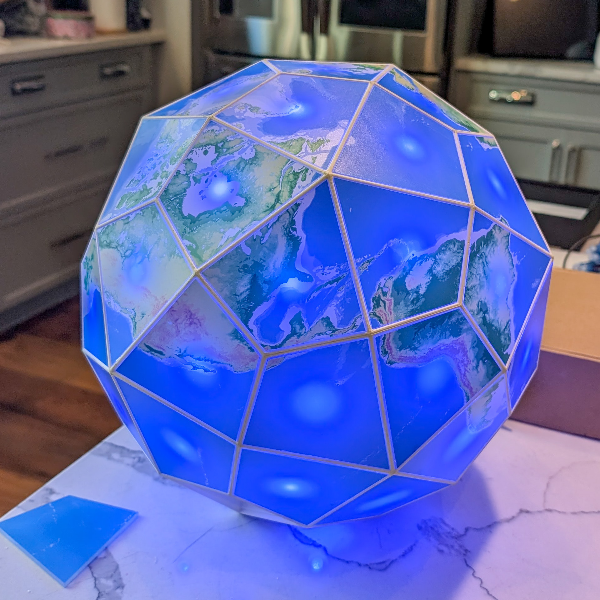 This one has been in progress since August of last year trying to plan ahead for when my eufyMake E1 UV printer would finally arrive. It didn’t get here until January, but many of you already know the challenges of backing a kickstarter campaign. The assembled polyhedral sat on a shelf patiently waiting on the eufyMake to arrive. Anyway, the only reason I even bought a 3D printer back in 2018 was to make a dymaxion globe which started me down a never-ending rabbit hole of building polyhedrals. Fast forward to buying a UV printer, this opened up a ton of new possibilities for adding color to my designs. The projection of this map was done using the Flexify photoshop plugin, printed on clear acrylic with the eufyMake e1, and laser cut on my Glowforge using Snapmarks.. The design of the Strombic Hexecontahedron was done in Fusion 360 and 3D printed on a Bambu X1-C. Of course lights were added and a small WLED controller was placed inside to create the lighting patterns because why not. It’s great being able to use multiple maker tools for this amazing globe.