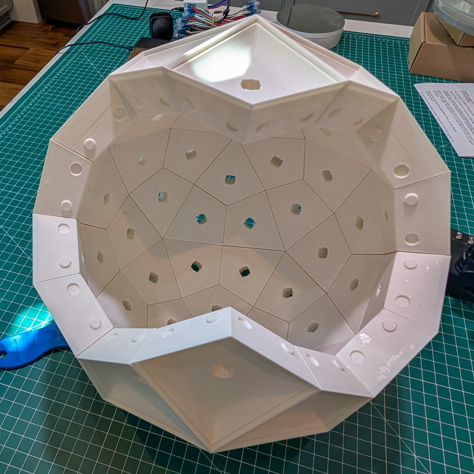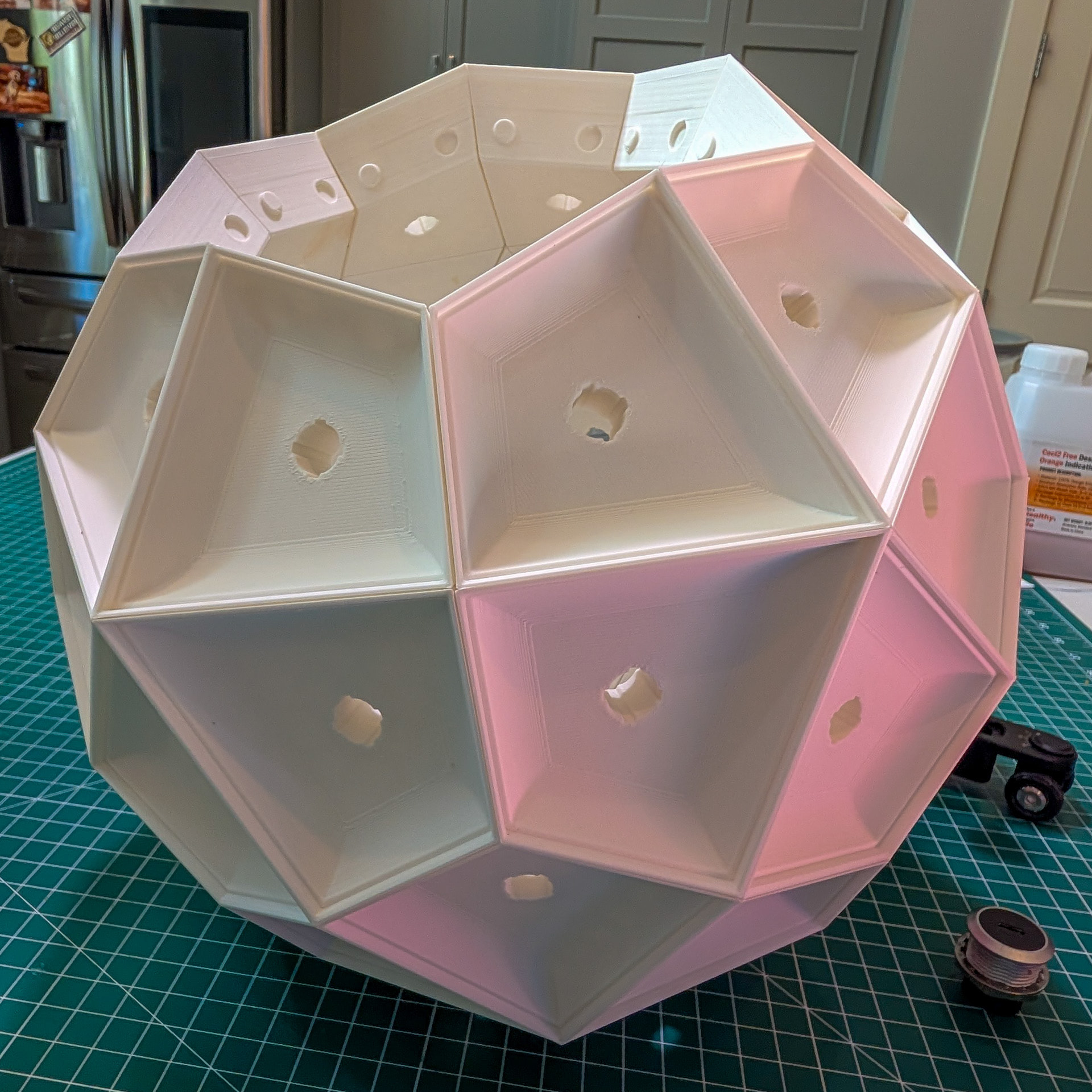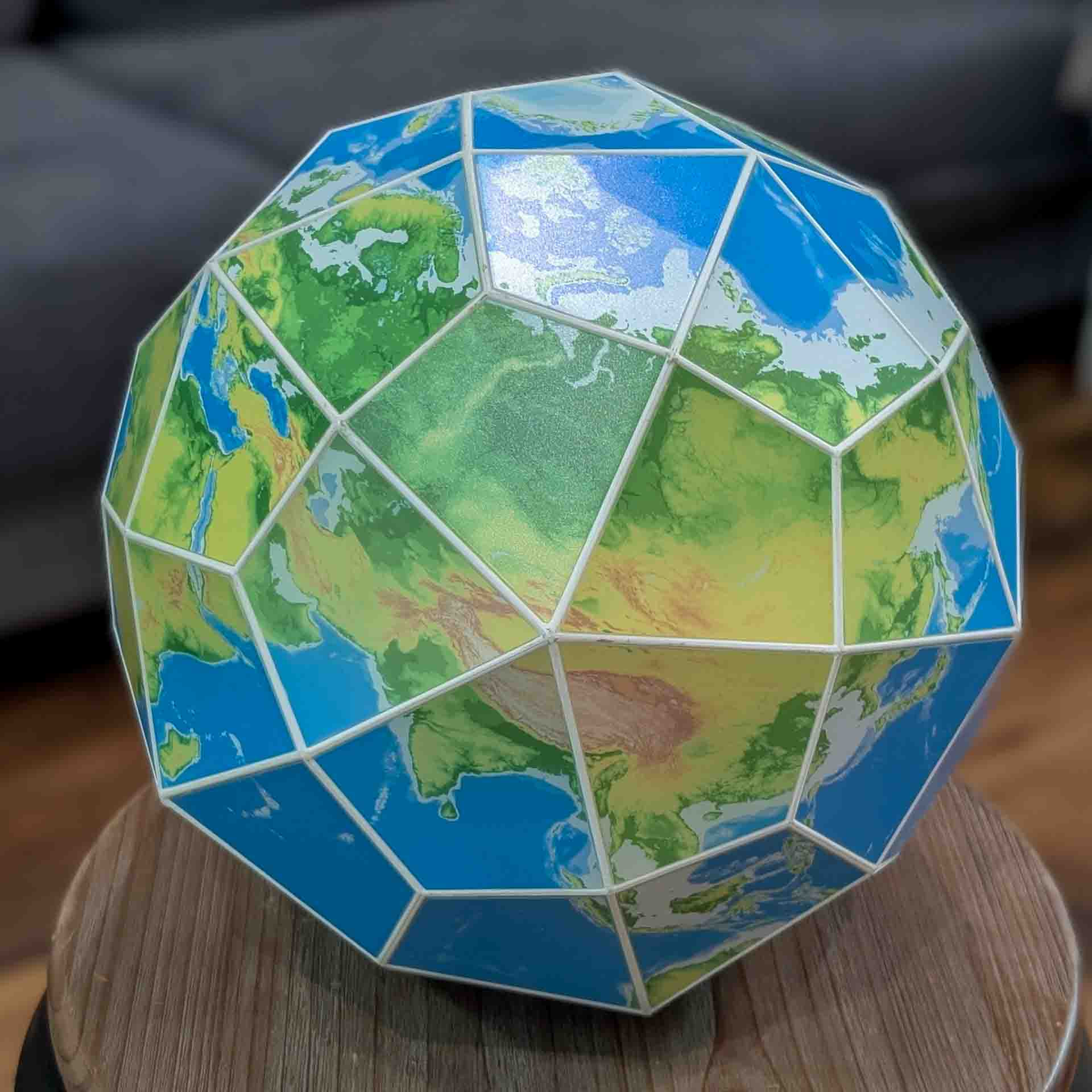 This one has been in progress since August of last year trying to plan ahead for when my eufyMake E1 UV printer would finally arrive. It didn’t get here until January, but many of you already know the challenges of backing a kickstarter campaign. The assembled polyhedral sat on a shelf patiently waiting on the eufyMake to arrive. Anyway, the only reason I even bought a 3D printer back in 2018 was to make a dymaxion globe which started me down a never-ending rabbit hole of building polyhedrals. Fast forward to buying a UV printer, this opened up a ton of new possibilities for adding color to my designs. The projection of this map was done using the Flexify photoshop plugin, printed on clear acrylic with the eufyMake e1, and laser cut on my Glowforge using Snapmarks.. The design of the Strombic Hexecontahedron was done in Fusion 360 and 3D printed on a Bambu X1-C. Of course lights were added and a small WLED controller was placed inside to create the lighting patterns because why not. It’s great being able to use multiple maker tools for this amazing globe.