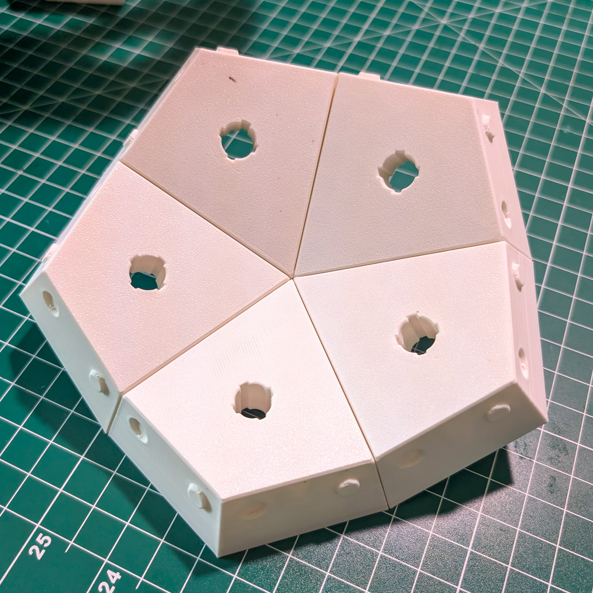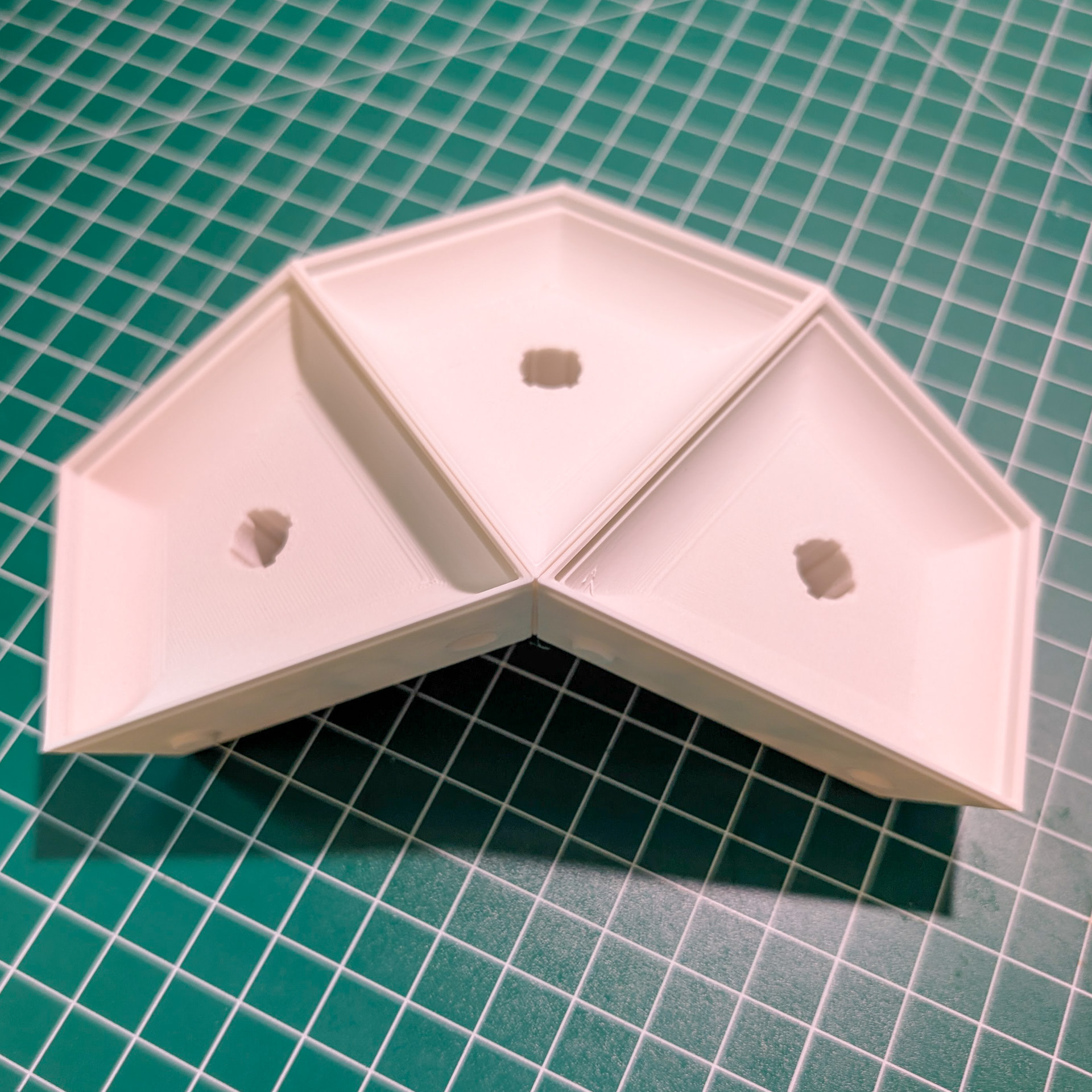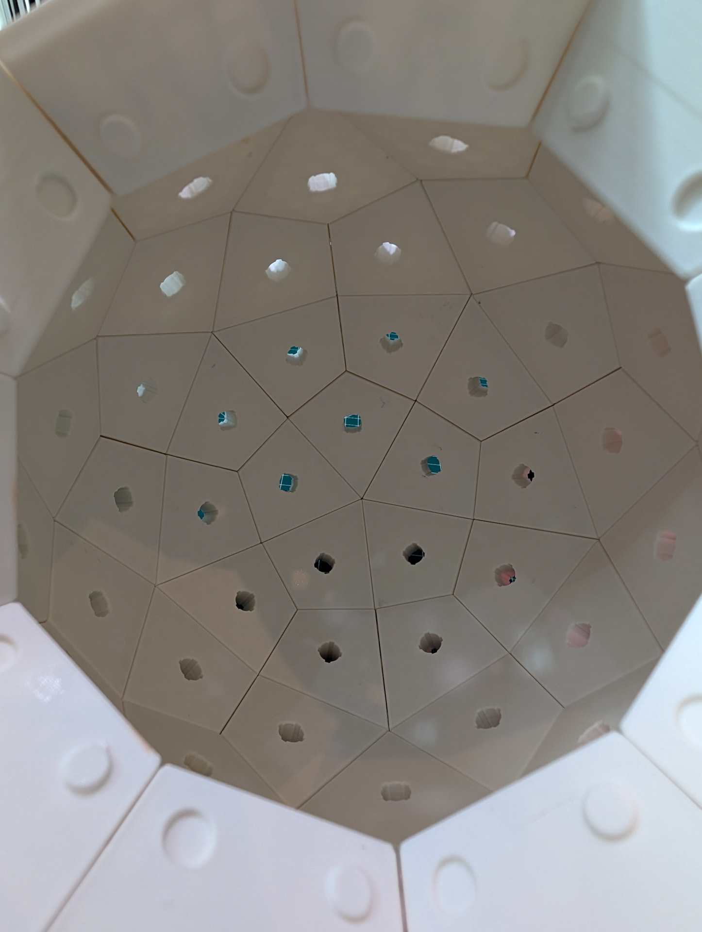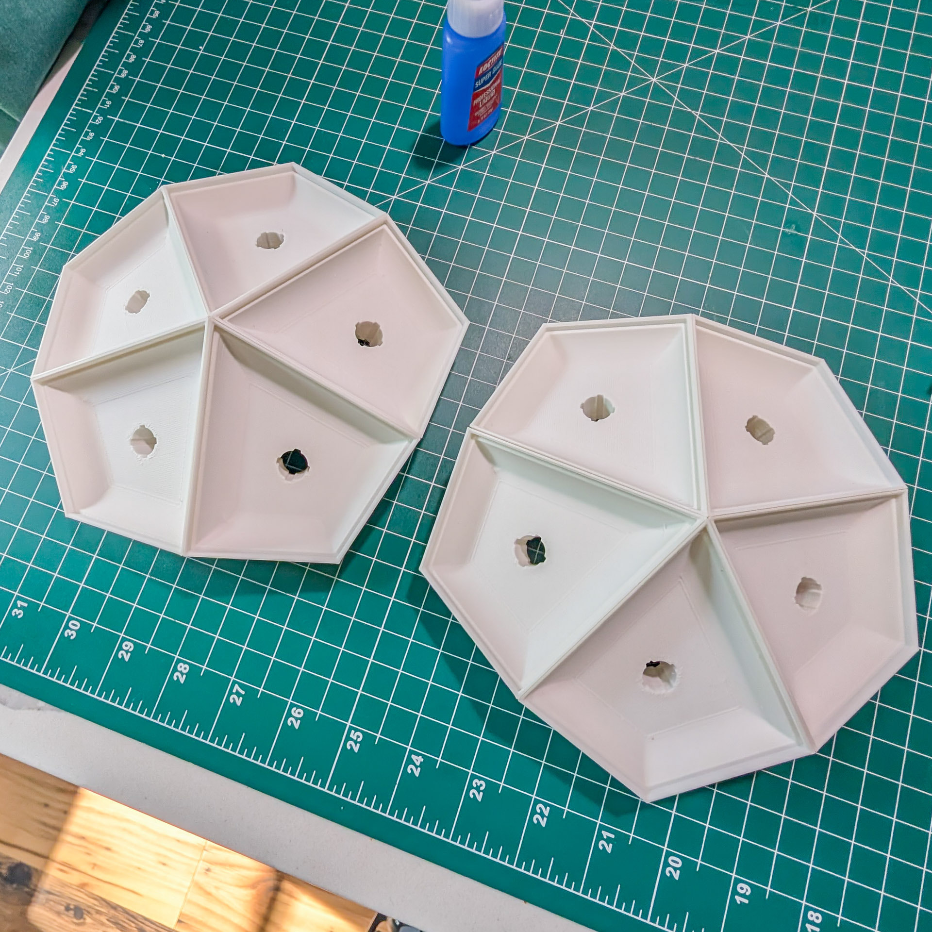 This one has been in progress since August of last year trying to plan ahead for when my eufyMake E1 UV printer would finally arrive. It didn’t get here until January, but many of you already know the challenges of backing a kickstarter campaign. The assembled polyhedral sat on a shelf patiently waiting on the eufyMake to arrive. Anyway, the only reason I even bought a 3D printer back in 2018 was to make a dymaxion globe which started me down a never-ending rabbit hole of building polyhedrals. Fast forward to buying a UV printer, this opened up a ton of new possibilities for adding color to my designs. The projection of this map was done using the Flexify photoshop plugin, printed on clear acrylic with the eufyMake e1, and laser cut on my Glowforge using Snapmarks.. The design of the Strombic Hexecontahedron was done in Fusion 360 and 3D printed on a Bambu X1-C. Of course lights were added and a small WLED controller was placed inside to create the lighting patterns because why not. It’s great being able to use multiple maker tools for this amazing globe.